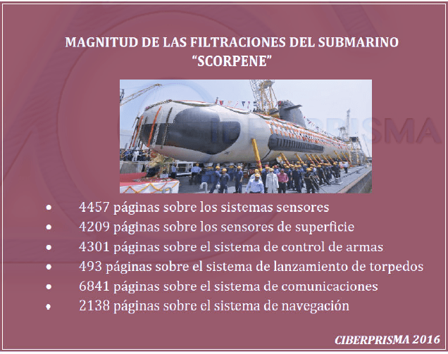 En agosto 2016 la empresa DCNS, cuya tercera parte del capital accionario pertenece al gobierno galo, fue víctima de una filtración masiva de documentación secreta relativa a las especificaciones técnicas y operativas de los Submarinos Clase SCORPENE. Parte de esos documentos fueron publicados por el periódico The Australian.