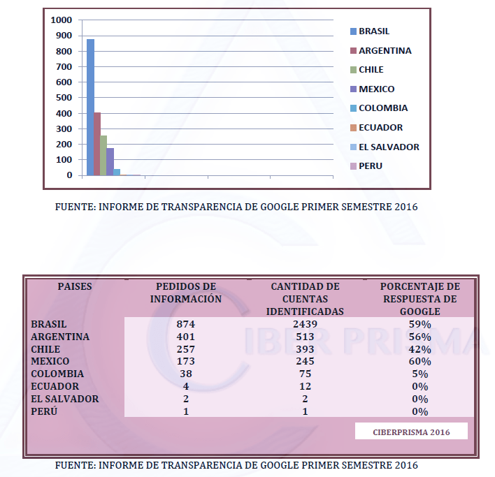 En octubre 2016 la empresa GOOGLE hizo público su Informe de Transparencia correspondiente al Primer Semestre 2016, en el cual consta que recibió en el período un total de 44.493 solicitudes de información procedentes de entes gubernamentales a nivel global, vinculadas a 76.713 cuentas de usuario, manteniendo la tendencia del segundo semestre del 2015. Destaca que por primera vez recibió solicitudes de países como Argelia, Bielorrusia, Islas Caimán, El Salvador, Fiji y Arabia Saudi y que en EEUU se refleja un aumento en la cantidad de solicitudes relacionadas con cuentas de usuario identificadas que fueron enviadas conforme a la Ley de Vigilancia e Inteligencia Extranjera (FISA por su sigla en inglés). En 2016 recibió entre 21.000 y 21.500 solicitudes, mientras que el rango correspondiente al mismo período en 2015 fue de 16.000 – 16.500.
