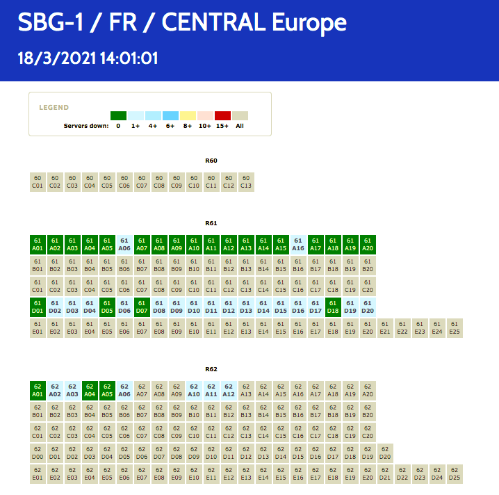 El Estado de los Servidores Recuperados (en Verde) en los Data Centers de OVH al 18 de marzo era la siguiente, según datos del Servicio de Monitoreo en Tiempo Real de la propia empresa. Los servidores en color gris son los que aún no recuperaron su nivel de operación: