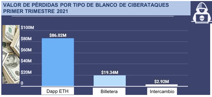 En 2021 veremos un incremento de ciberataques a las DApp o aplicaciones descentralizadas del ecosistema DeFi, según expertos en ciberseguridad. A juzgar por las cifras que presenta Atlasvpn en su informe basado en datos de SLOWMIST HACKED, las DApps de Ethereum (ETH) resultaron las más afectadas, protagonizando el 51% de los robos perpetrados durante el primer trimestre del año. Si bien esa cifra sorprende, en realidad se trató de 11 intrusiones seguidas de robo de valores y 5 eventos de estafa, que acumularon 86 millones de dólares de un total de 108 millones de dólares obtenidos a partir de los 33 ataques registrados en ese período. Y si tomáramos el año 2020 completo hasta el segundo trimestre 2021 tendríamos un aumento del 433% en ciberataques a las aplicaciones descentralizadas ETH. Comparativamente, en el mismo período, las billeteras de cadena de bloques sufrieron un aumento del 140% (de 5 a 12 infracciones). Finalmente los ataques exitosos a los intercambios de cripto activos aumentaron un 63% (de 3 a 5). Lamentablemente el informe no identifica los proyectos que fueron víctimas de ataque, ni los activos extraídos de cada uno.