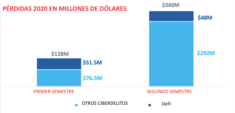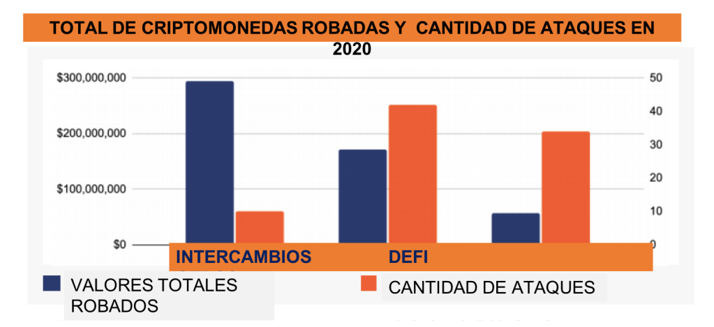 En 2019 la ciberseguridad de las DeFi no figuraba en el radar de los principales riesgos que amenazaban al sector financiero. Sin embargo, durante 2020 solamente, estas plataformas sumaron 100 millones de dólares al volumen total de pérdidas por ciberataques. Según datos de CypherTrace, las DeFi concentraron el 45% y el 50% del volumen total de robos de valores durante el primer y segundo semestre respectivamente. Sin embargo cabe resaltar que el aumento producido en el segundo semestre se debió puntualmente al hacking perpetrado contra un intercambio centralizado, KuCoin. Este incidente impactó en el mercado DeFi porque los perpetradores intentaron lavar los fondos apropiados ilícitamente a través de Uniswap, uno de los mayores intercambios descentralizados del mundo. De esta manera se hacen evidentes dos de los principales riesgos que encarna la ciberdelincuencia para las DeFi: ser víctimas de robo de fondos bloqueados o resultar particularmente atractivas para operaciones de lavado de dinero.