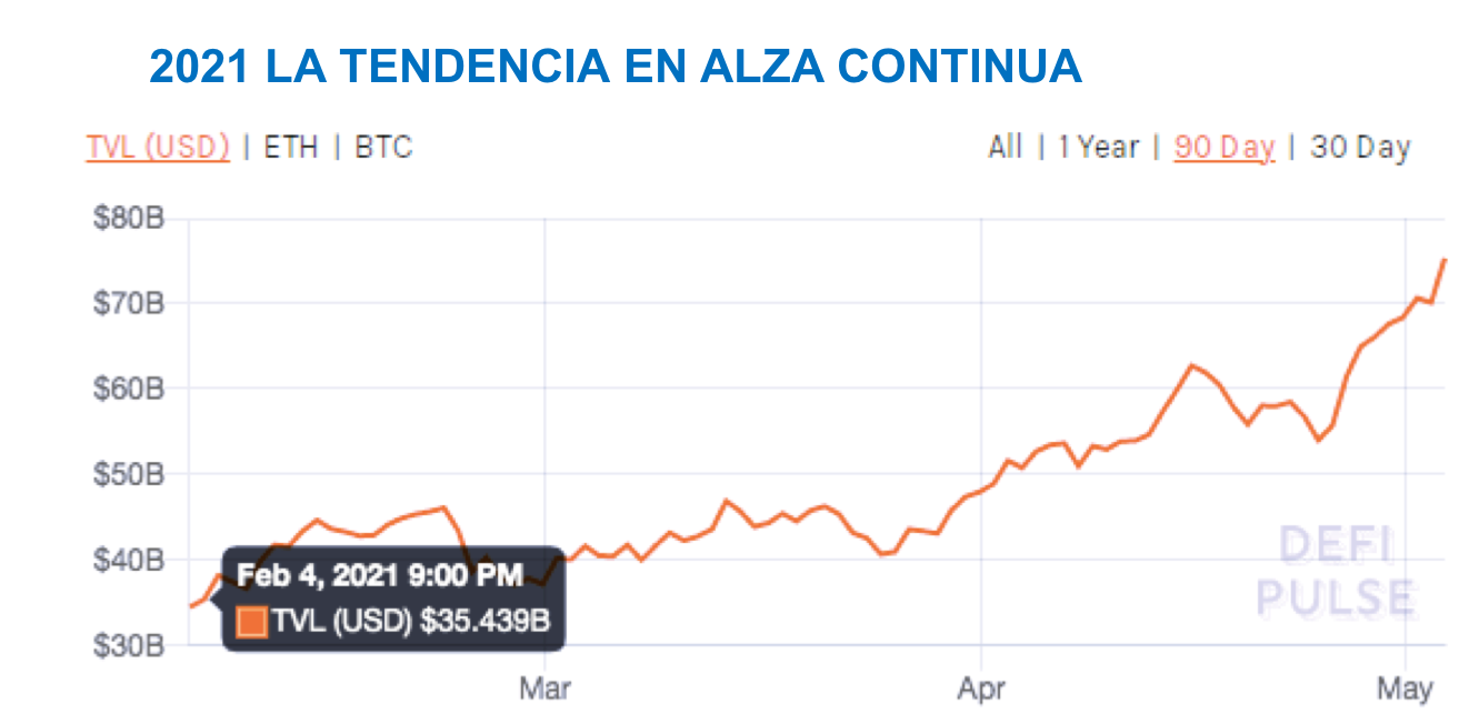 Para entender las cifras, en este ecosistema se habla de montos o valores «bloqueados» para referirse al monto de dinero que los usuarios confían a este tipo de sistemas. En 2020 se llegó rápidamente a 15.000 millones de dólares y en el primer trimestre del 2021 Defipulse calcula que superarán los 80.000 millones de dólares, con previsiones de alcanzar los 100 billones de dólares en 2022.