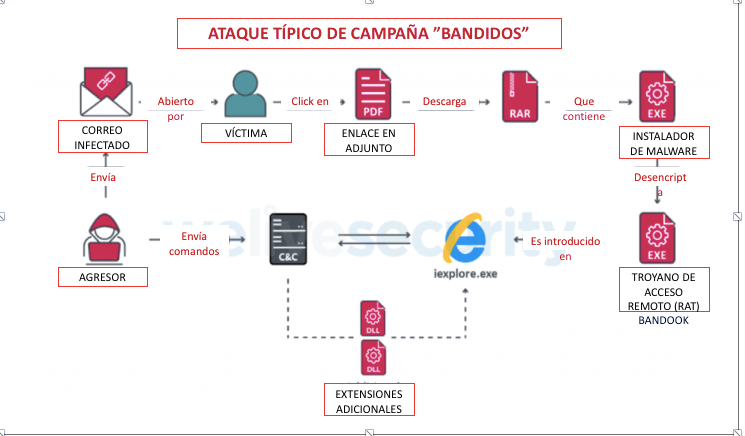 La empresa de ciberseguridad ESET informó que detectó una campaña de espionaje desplegada en países de habla hispana. “Bandidos”, tal es el nombre de fantasía asignado a esta, emplea nuevas versiones del Código Malicioso Bandook, un antiguo conocido en el mundo de la ciberseguridad. En efecto, su certificado de origen se atribuyó a un desarrollador libanés en 2007 pero su actividad no fue documentada sino hasta mediados de la década pasada, cuando otras empresas de ciberseguridad atribuyeron una serie de ciberataques a dos empresas privadas vinculadas al gobierno de Kazajistán y al grupo que denominaron “Dark Caracal” vinculado al gobierno libanés.
