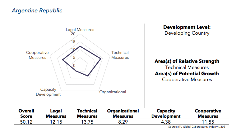 En 2021, la Argentina escala su posición en el espacio mundial en el ranking de ciberseguridad al puesto 91, destacándose en las medidas técnicas como una de las áreas con relativa fuerza y en el área cooperativa como aquella con un crecimiento potencial. Sin embargo, en la región cae al puesto 13 debajo de Perú y Costa Rica, con lugares 12 y 8 respectivamente, países que superan a Argentina respecto a 2018.