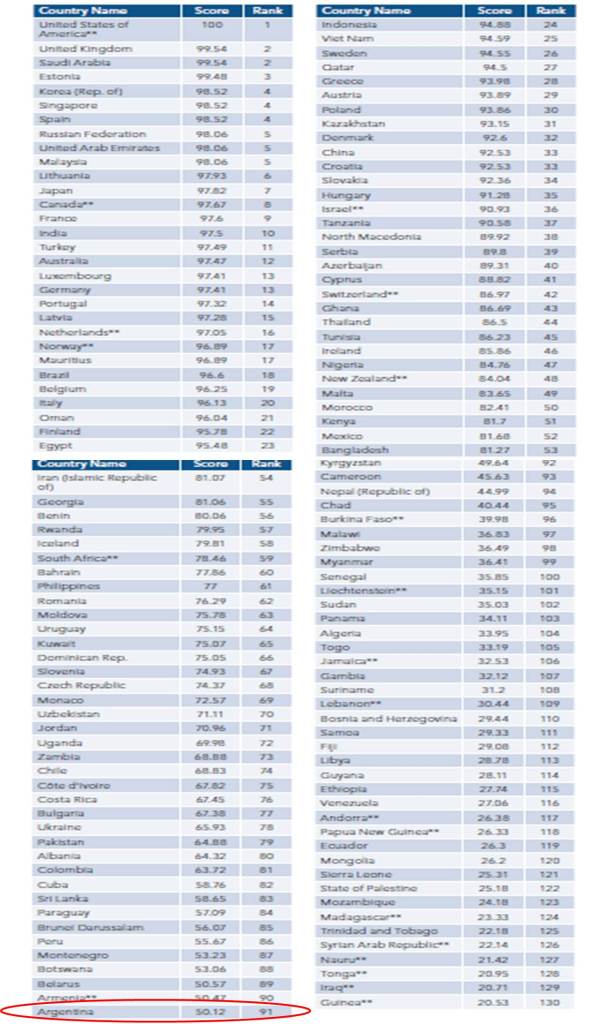 El Índice Global de Ciberseguridad 2020 muestra el ascenso de Argentina en su posición mundial respecto al 2018 y un retroceso a nivel regional (Argentina en el ranking regional y mundial 2018) .