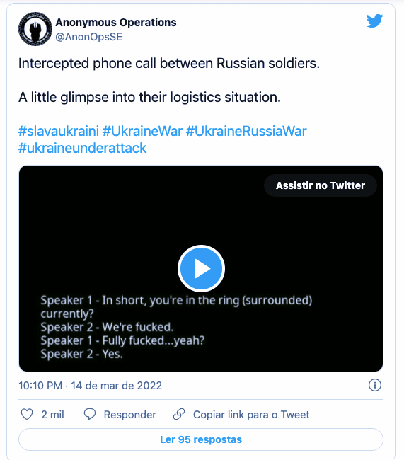Hacktivistas anónimos también continuaron atacando las comunicaciones militares rusas, incluso interfiriendo frecuencias de radio pertenecientes a las fuerzas armadas del país e interceptando llamadas.