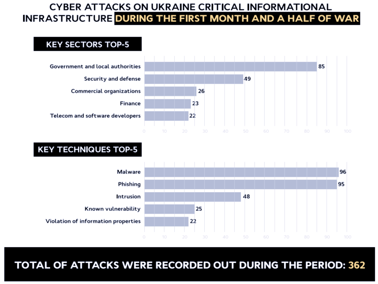 Durante el primer mes y medio de guerra, Ucrania sufrió 362 ciberataques. Cifra que representa tres veces más en comparación con el mismo período del año pasado (122 ataques cibernéticos).