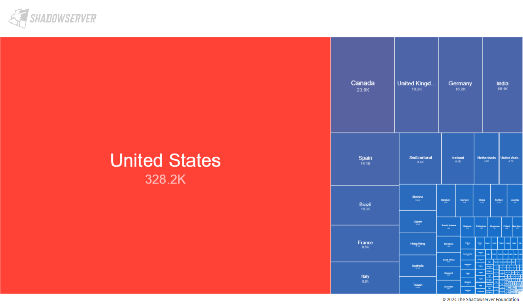 Los datos de la plataforma de monitoreo de amenazas Shadowserver indican que, actualmente, hay más de 500.000 firewalls de SonicWall expuestos en línea y están distribuidos de la siguiente manera: