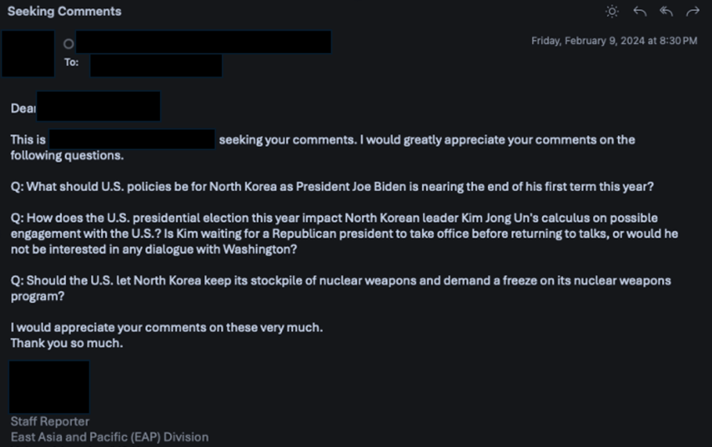 – Desde 2023, Kimsuky ha solicitado directamente a expertos en política exterior sus opiniones sobre desarme nuclear, políticas US-ROK y sanciones a través de conversaciones «benignas» de correo electrónico.