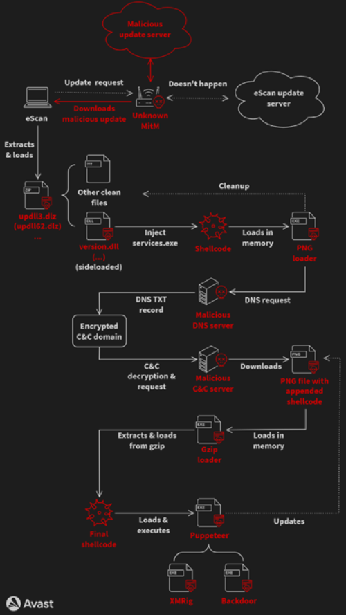Esta intrincada cadena de infección explota una vulnerabilidad en el mecanismo de actualización de eScan para propagar el malware a través de un ataque de adversario en el medio (AitM).