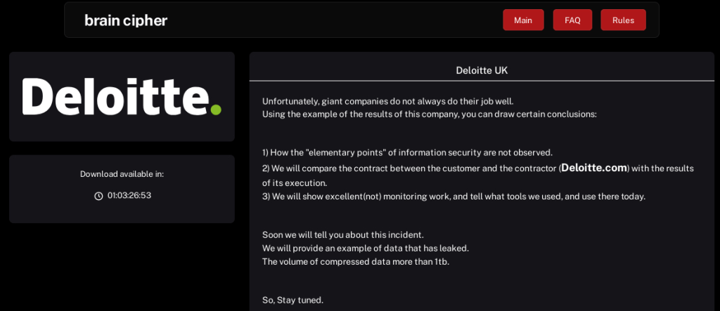 En Diciembre del 2024, el grupo de ransomware Brain Cipher ha Brain Cipher afirmó haber vulnerado a la empresa Deloitte UK y exfiltrado más de 1 terabyte de datos confidenciales. Este ataque en particular tuvo repercusión ya que Deloitte ofrece servicios a múltiples empresas, de las cuales posee información.