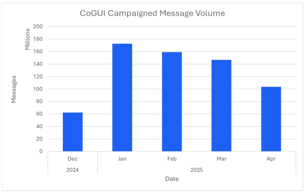 Las campañas, activas desde octubre de 2024, fueron variando en volumen desde cientos de miles hasta decenas de millones de mensajes, alcanzando su punto máximo en enero de 2025 con más de 172 millones de correos enviados.