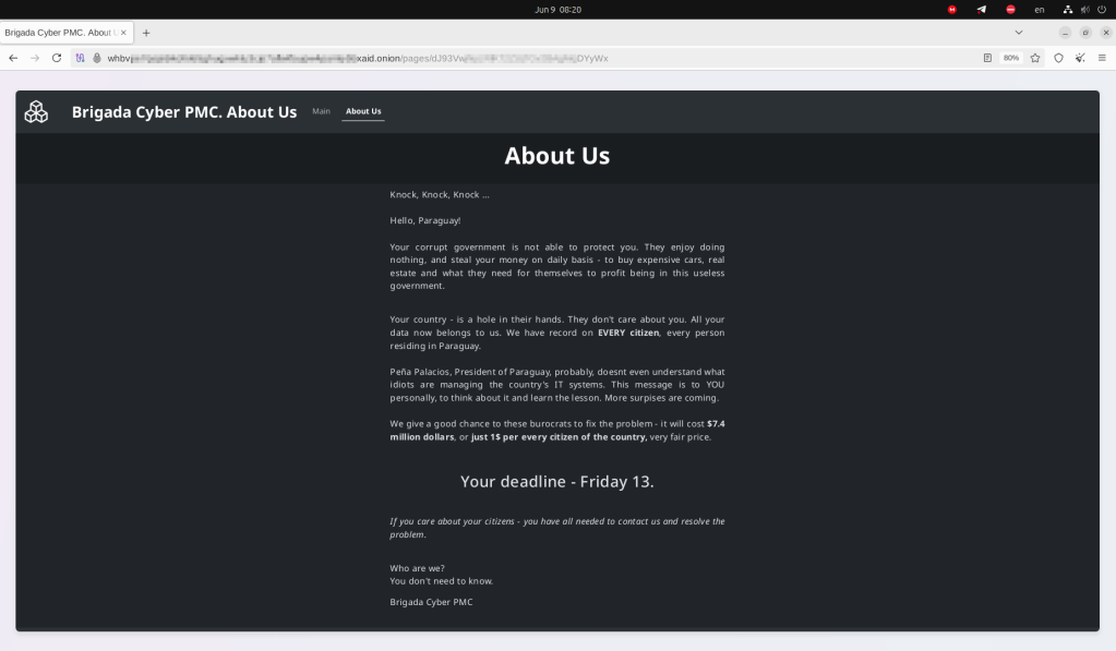 Paraguay enfrenta la mayor filtración de datos de su historia: información sensible de más de 7,4 millones de personas fue robada y puesta a la venta en foros del underground. Los archivos, publicados el pasado viernes 13 de junio en formato ZIP y distribuidos a través del protocolo Torrent, contienen datos personales identificatorios (PII) como nombres completos, números de documento, fechas de nacimiento, estado civil, profesiones, y más.