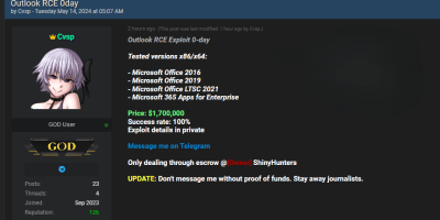 Alertaciber, Ciberdelitos Importante actor de amenazas afirma venta de exploit 0-Day de RCE para Outlook por $1,700,000 mayo 14, 2024 — 0 Comentarios
